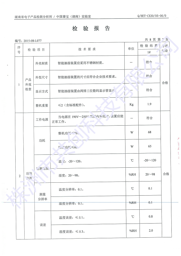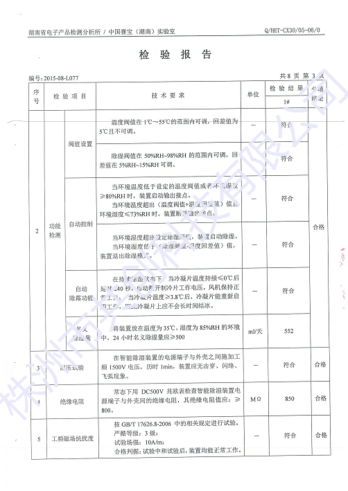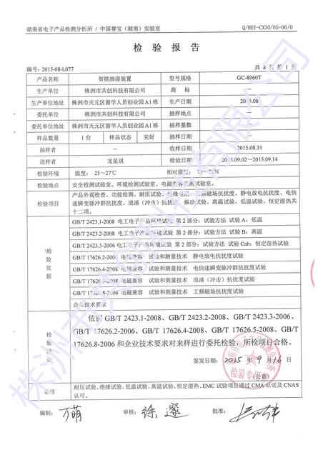 我公司針對GC-8030T的除濕效果做了相關(guān)實驗,把GC-8030T放在一個1.5立方米的密封箱體內(nèi),開啟手動除濕功能,3個小時候后,濕度由原來的75.6%RH降到了51.2%RH左右;溫度由原來的25.1度上升到32.7度。實驗結(jié)果,濕度下降了24.4%RH,溫度只上升了7.6度,;實驗結(jié)果表明:使用GC-8030T可全部解決箱體內(nèi)的驅(qū)潮問題,而且很大除濕功率只有60W。
